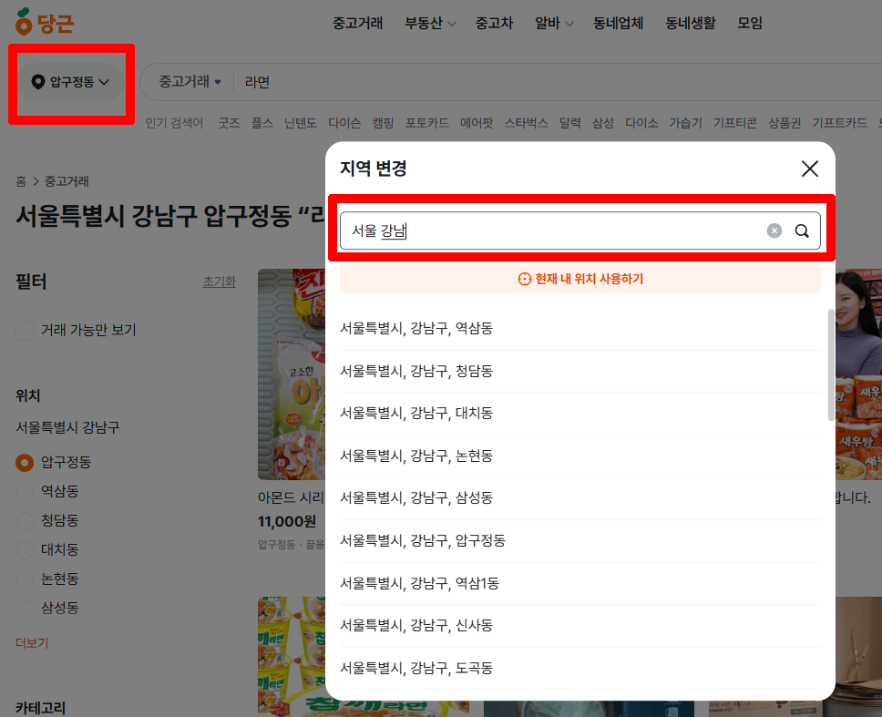 지역을 직접 입력 (예. 서울 강남) 해서 직접 동네를 선택할 수도 있어요.