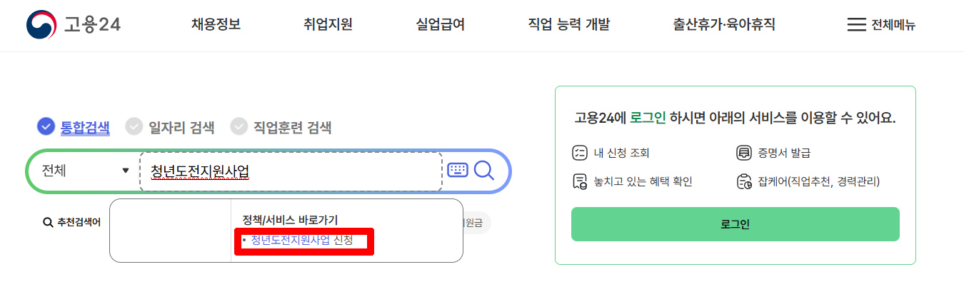 2. 온라인 신청 : 청년도전지원사업 입력 -> 청년도전지원사업 신청 클릭